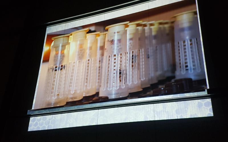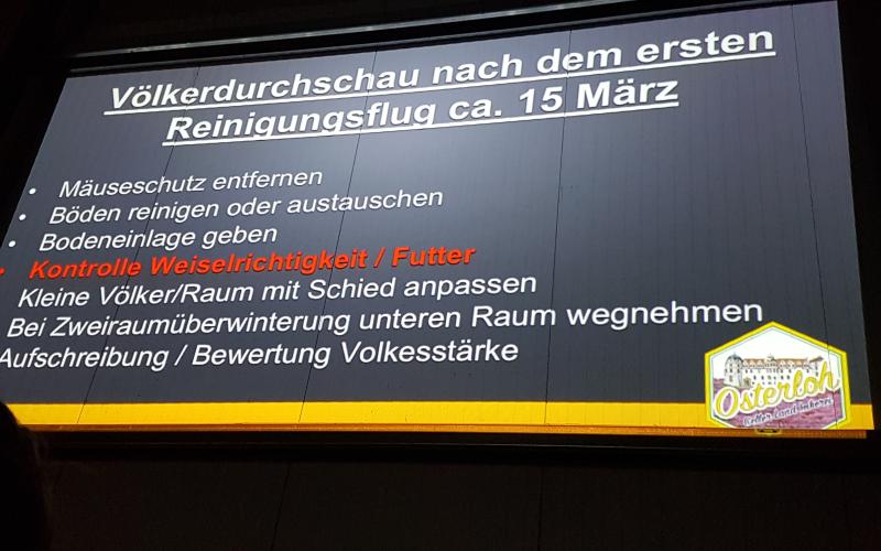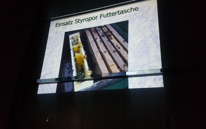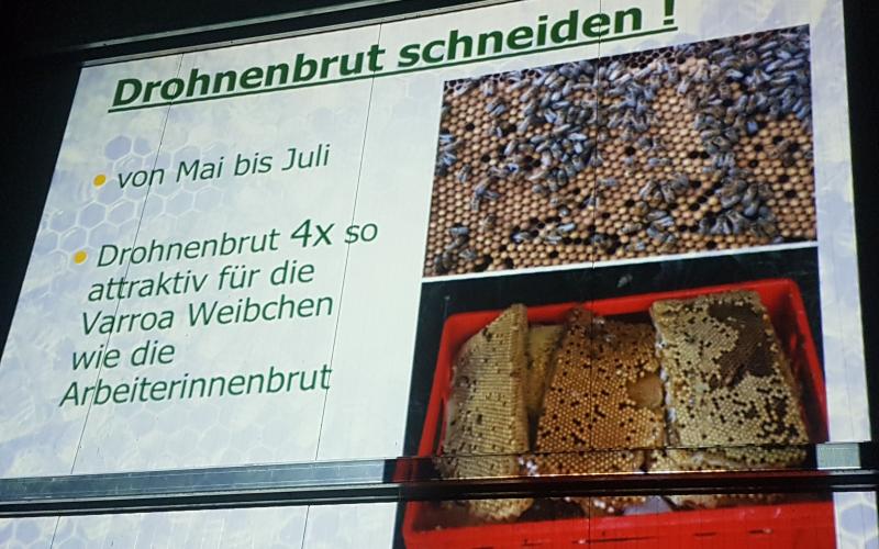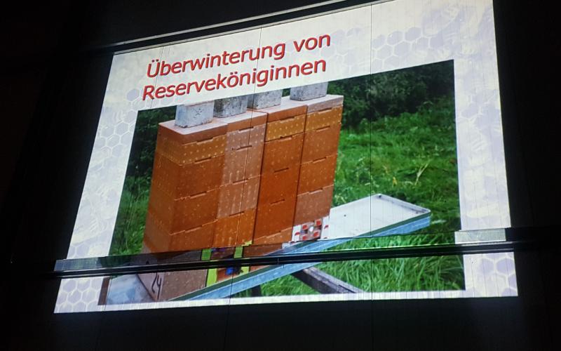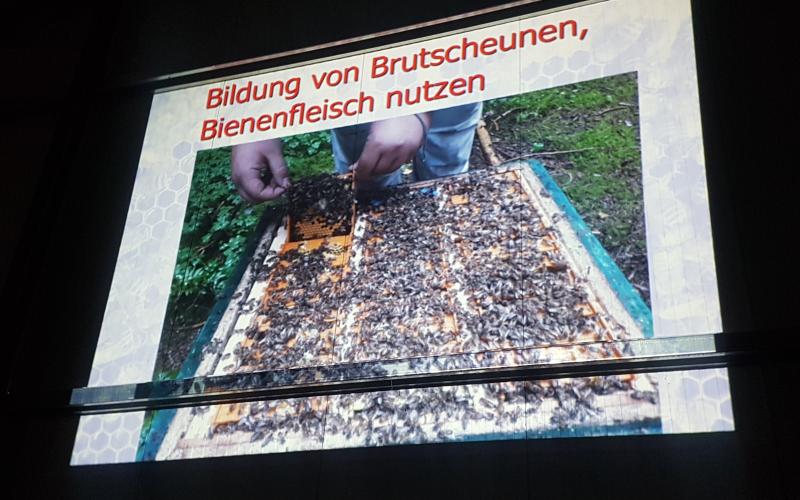 Wer wie Herr Osterloh in der Saison sage und schreibe 100 Königinnen pro Tag schlüpfen sieht und deren Begattung am Stand sowie auf Insel- und anderen Belegstellen organisiert, verdient großen Respekt. Da erscheint es nur sinnvoll, den Arbeitsaufwand an den Wirtschaftsvölkern so gering wie möglich zu halten, wie aus seinem Vortrag hervorging: Seine Völker, die auf Normalmaß-Rähmchen in Segeberger-Beuten wohnen, besiedeln nur eine Brutzarge. Der inzwischen verstorbene Hans Beer hatte dem Imker diese Betriebsweise ans Herz gelegt. Frühzeitig aufgesetzte Honigräume bieten den Bienen dennoch ausreichend Platz und mindern den Schwarmdruck.