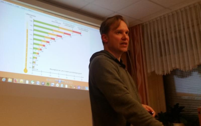 Eine natürliche Baumhöhle sei oben durch eine Kappe aus Propolis isoliert, die wie eine Goretex-Membran Wasserdampf durchlasse aber Kondensat nicht. Dadurch könne das darüberliegende Holz über die Poren im Stirnholz große Mengen an Feuchtigkeit aufnehmen und daher eine besonders warme und trockene Atmosphäre - gerade im Winter - entstehen. Der dort gelagerte Honig diene dann auch als Wärmepuffer und kristallisiere nicht/langsamer. Nach seinen Messungen war der Strohkorb und die Klotzbeute noch am besten; die Segeberger war zwar vergleichbar warm aber viel zu feucht - optimal seien weniger als 80% Luftfeuchte bei 20°C. Die Bienenkugel sei in der runden Form eigentlich nicht korrekt proportioniert und leider auch nicht aus korrekt orientierter Holzmaserung geschnitten. Er gab in diesem Zusammenhang auch Bautipps für eigene "Trockenzargen" um Beuten trocken zu legen.