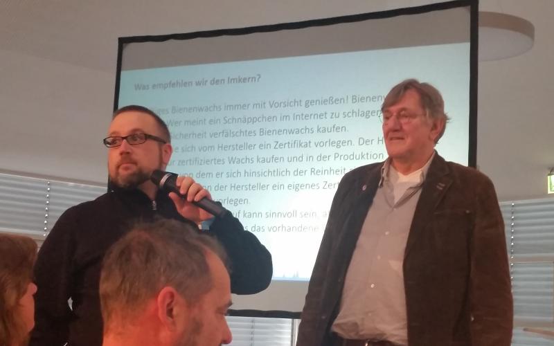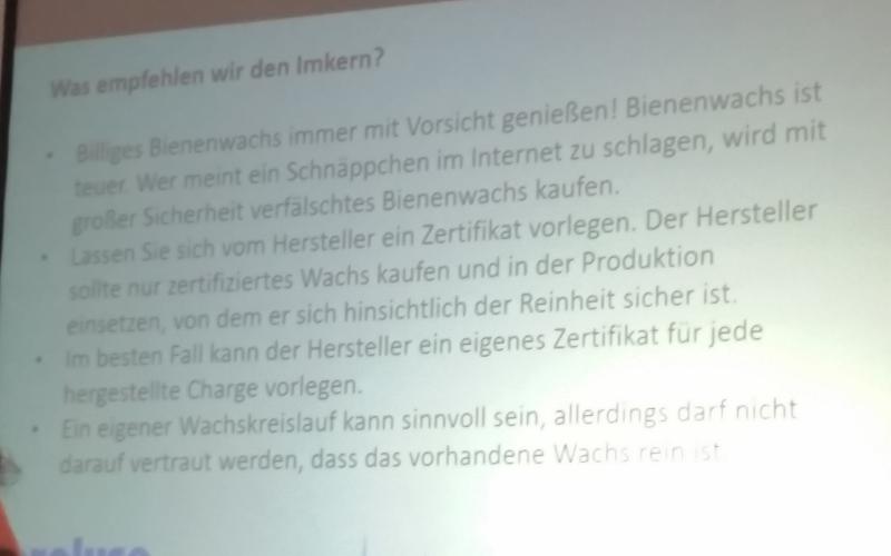 Der Vortrag von Dr. Scholz (Fa Ceralyse) ähnelte dem aus Celle; allerdings war interessant zu hören, dass aktuell afrikanisches Wachs auftauche, das mit euopäischem, paraffin-gestrecktem gemischt werde. Zudem hätten sich immer wieder Imker gemeldet, die "gutes" da "100%iges Bienenwachs" von ALDI kaufen würden (Bastelset zum Rollen von Kerzen). Er wies noch mal darauf hin, dass "100% Bienenwachs" lt. Kerzenstandard noch rund 4% Paraffin enthalten könne und das auch ziemlich sicher tue.