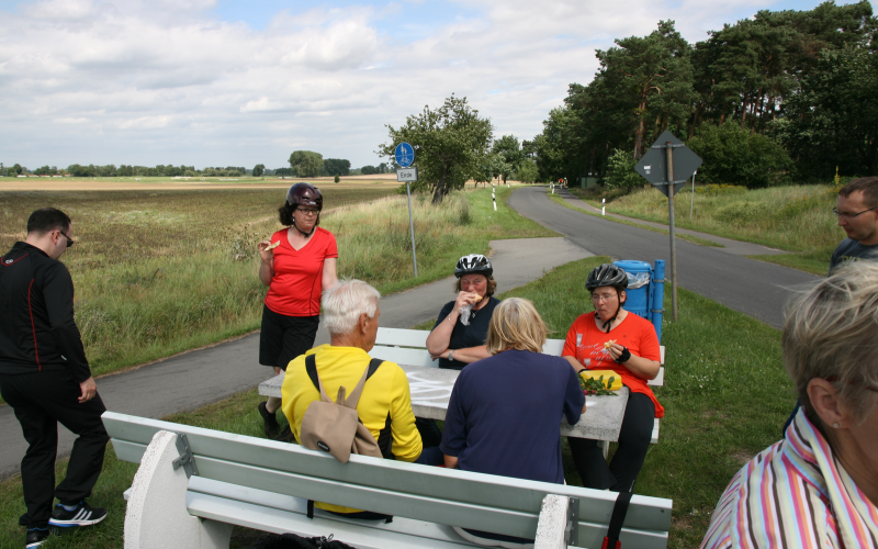 Viereinhalb Stunden ging es bei schönem, nicht zu heißem Wetter auf dem gut asphaltierten Havelland-Radwegs durch die Havelwiesen. Störche, Kraniche und Gänse ließen sich blicken und weder Panne noch Unfall trübten die Tour. In Brandenburg musste es dann noch quer durch die Altstadt gehen. Am höchsten Punkt der Stadt erwarteten uns schon die Imker der Brandenburger Vereins. Sie hatten einen tollen Tisch mit Blick über die Stadt reserviert und nach den gut 55 Kilometern waren alle Wasservorräte und Muskelreserven erschöpft. Nach dem Auftanken ging es dann - allerdings mit Motorkraft - zu dem etwas außerhalb gelegenen Lehrbienenstandes, den der Verein mit viel Ehrenamt pflegt und hegt.