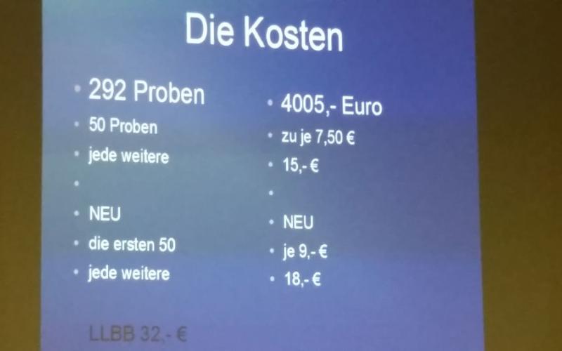 Andreas Schwiede, der Gesundheitsobmann, beklagte die hohen Kosten und geringen Aussagekraft der Futterkranzproben in 2015. Aufgrund der angespannten Haushaltslage wird es 2016 keine bezahlten Futterkranzproben des LV geben! Er schlug ein System vor mit dem die Verteilung der Proben zentral gesteuert wird um eine möglichst flächige Verteilung sicher zu stellen. Dies wird mit den Gesundheitsobleuten der Vereine diskutiert werden.