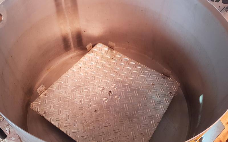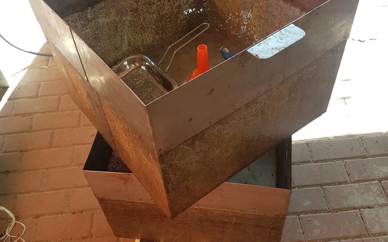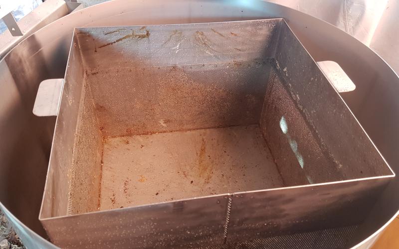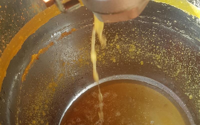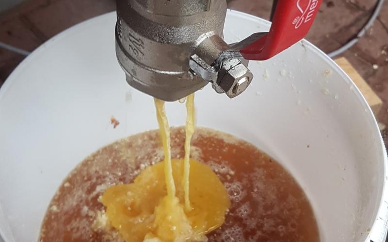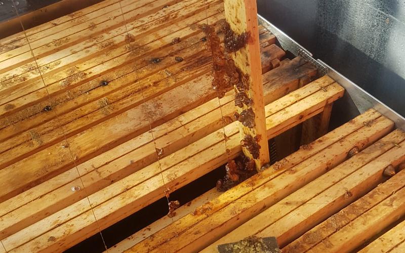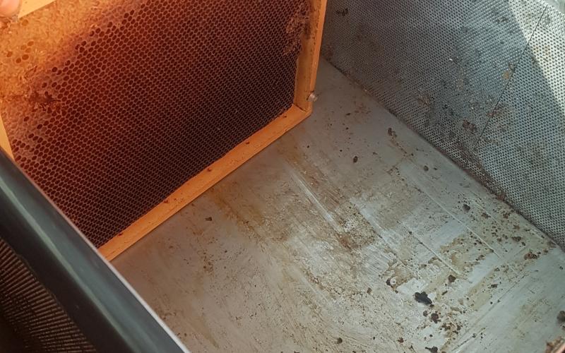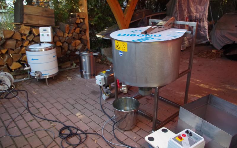 Das Ergebnis konnte sich dennoch sehen lassen - sehr trockener, allenfalls klebriger Trester. Sehr schnell konnten wir zwei Schleuderungen durchführen und jeweils 14 Waben ausschmelzen. 14 weitgehend Futter- und Pollen-geleerte Waben (DN 1,5) lieferten ca. 1,4 kg Wachs - also rund 100 Gramm pro Rähmchen. Das ist eine gute Ausbeute für das Format zumal das Wachs bereits sehr sauber gewonnen werden kann. Lässt man es durch einen Nylonstrumpf in einen im Wasserbad auf Schmelztemperatur gehaltenen Eimer fliessen so kann es anschließend im gut isolierten Zargenturm oder im Wärmeschrank langsam abkühlen und trennt sich sehr sauber. Nach dem Erstarren kann der Wachsblock auf der Unterseite abgekratzt werden. Im Tiefkühler gelagert kann er dann mit Hammer und Meissel gebrochen werden um stückweise für die weitere Verwendung aufgeschmolzen zu werden. Ein weiterer Reinigungsschritt durch Aufschmelzen in kalkfreiem Wasser ist offenbar nicht erforderlich. wobei uns Erfahrungen mit der Verwendung als Kerzenwachs noch fehlen.
