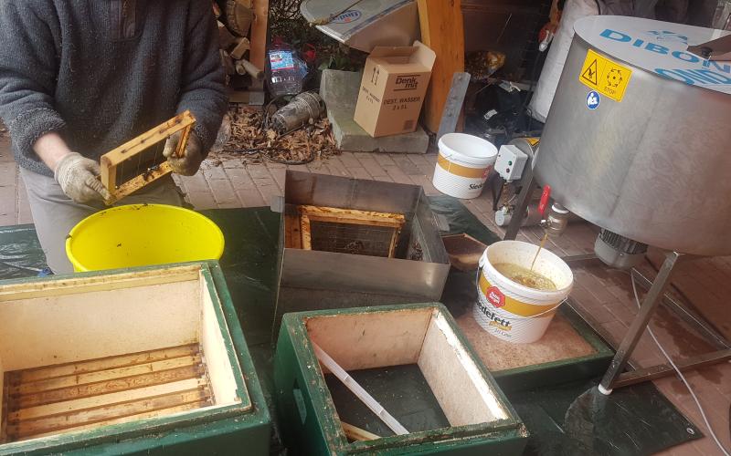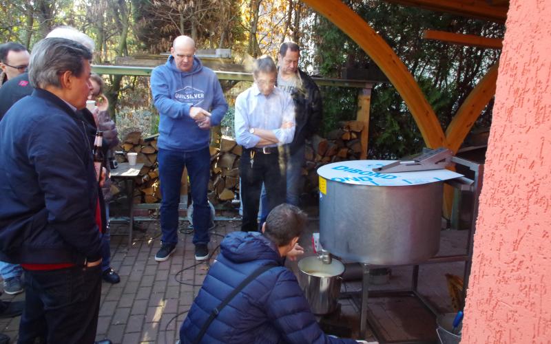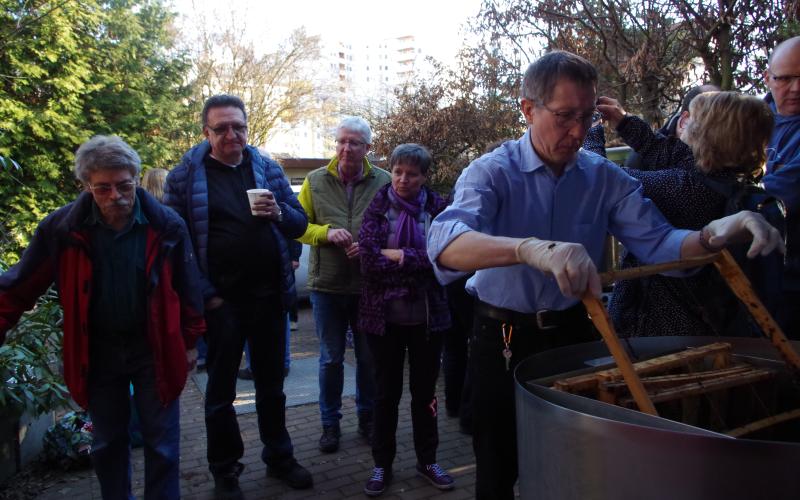 Bei strahlend-schönem Wetter und rund 14 Grad öffneten sich die ersten Elfenkrokusse und bekamen Bienenbesuch während wir uns zum "Wintergrillen" trafen und erstmals die HAMAG-Wachsschleuder in Betrieb nahmen.