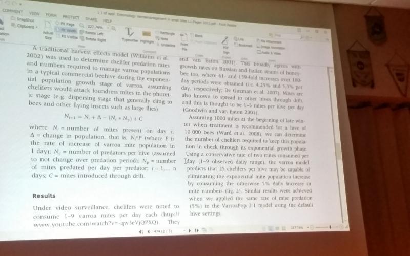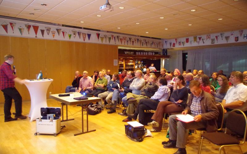 Torben Schiffer berichtete aus seinen Untersuchungen der Klimata in natürlichen und künstlichen Bienenbehausungen und der Rolle des Bücherskorpoions, der in wilden Bienenvölkern mit rund 150 bis 200 Exemplaren noch zu finden aber durch die moderne Bienenhaltung verloren gegangen sei. Sein Vortrag gab viele Anregungen und lebhafte Diskussion bei den rund 50 Zuhörern.