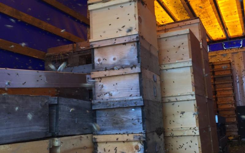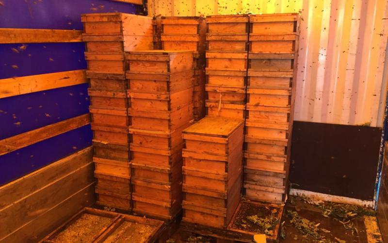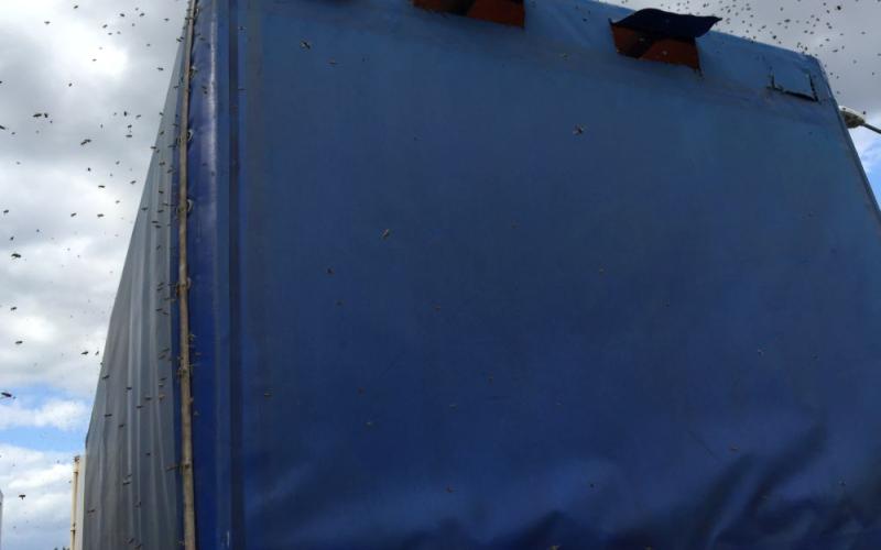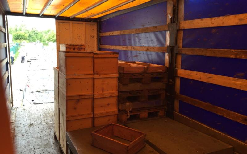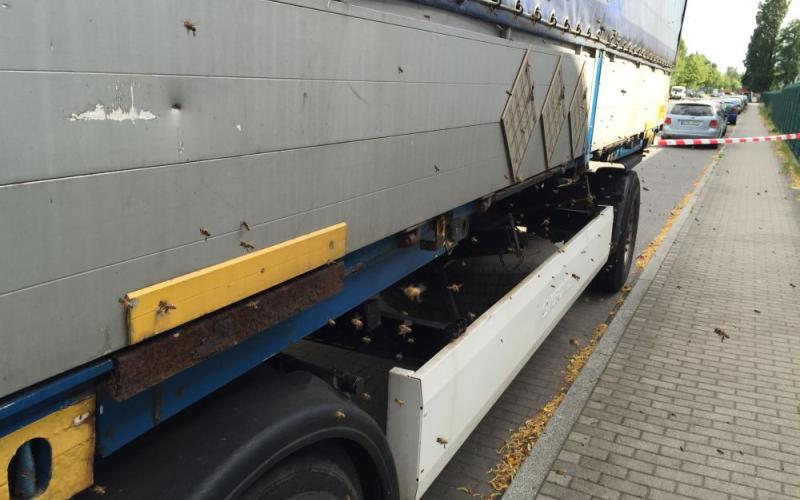 Ein Bienenschwarm am Lkw war die Meldung aber vor Ort stellte es sich als imkerlicher Ausnahmezustand dar: Unser Mitglied Mesut Erdem fotografierte diesen Fall schwerer Räuberei an leergeschleuderten Honigzargen, die von einem Großimker in einem Industriegebiet in Reinickendorf gelagert wurden. In Massen fielen die Bienen über die Zargen her und verursachten große Aufregung unter Passanten, Polizei und Ordnungsamt. Der herbeigerufene Amtstierarzt konnte schließlich erreichen, dass der Hänger am Abend durch den Halter entfernt wurde. Man kann nur sehr hoffen, dass die Zargen wirklich nichts außer Honig enthielten - Erkrankungen wie die Amerikanische Faulbrut können durch solche Zwischenfälle hervorragend verbreitet werden!