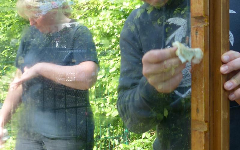 Nachdem wir schon im letzten Jahr ein Schauvolk im Bienengarten des Imkereimuseums zeigen konnten, sollte dort auch in diesem Jahr ein Bienenvolk ausgestellt werden. Am 12. Mai war es dann soweit. Ein Ableger von Ines und Ole Gemeinhardt zog in die Schaubeute ein. Die Bienen machten sich sofort daran, eine Weisel zu ziehen. Am 16. Mai waren schon ca. 5 Weiselnäpfe auf beiden Seiten der Brutwabe zu sehen.