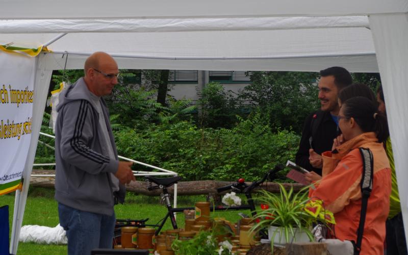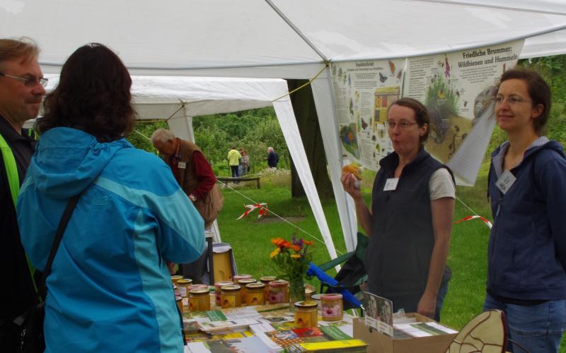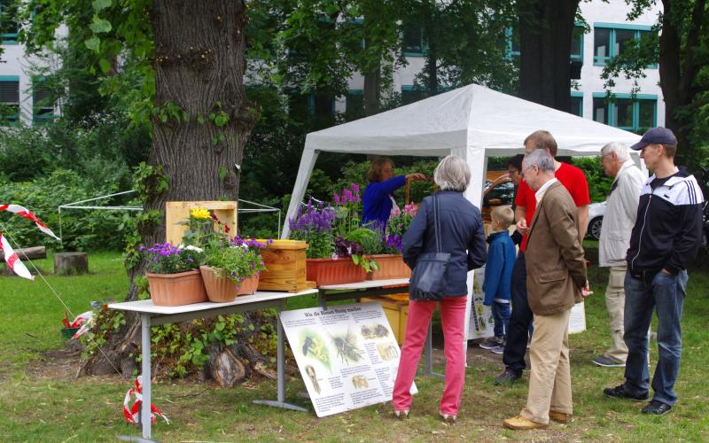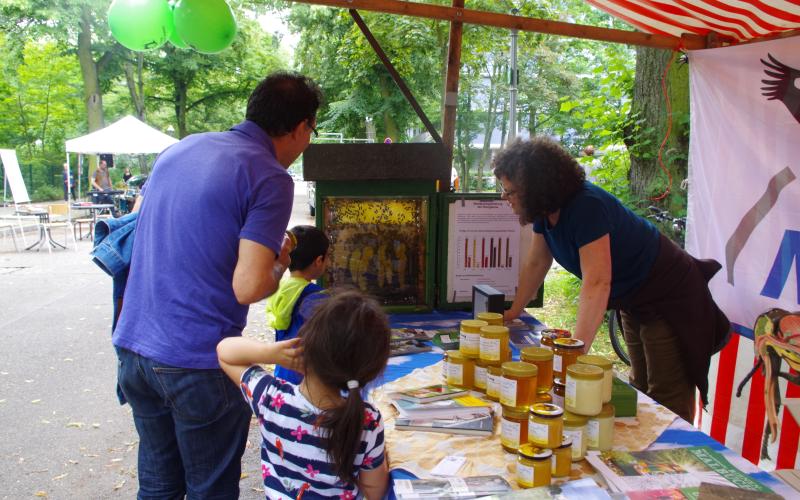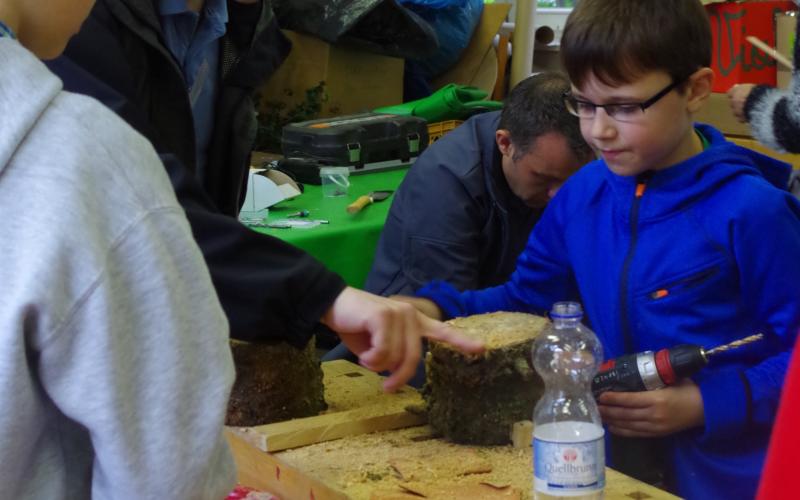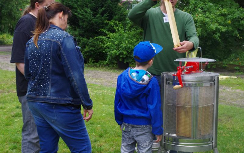 Zahlreiche Wildbienen-Nisthilfen entstanden in der Holzwerkstatt des SUZ, mit Wasser gefüllte Waben wurden in der Plexiglas-Schauschleuder geschleudert und bienenfreundliche Samenmischungen und Honig angeboten. Die Kinder konnten malen und basteln; ein Bienenquiz lockte mit Preisen.