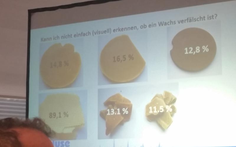 Der Vortrag von Dr. Scholz (Fa Ceralyse) ähnelte dem aus Celle; allerdings war interessant zu hören, dass aktuell afrikanisches Wachs auftauche, das mit euopäischem, paraffin-gestrecktem gemischt werde. Zudem hätten sich immer wieder Imker gemeldet, die "gutes" da "100%iges Bienenwachs" von ALDI kaufen würden (Bastelset zum Rollen von Kerzen). Er wies noch mal darauf hin, dass "100% Bienenwachs" lt. Kerzenstandard noch rund 4% Paraffin enthalten könne und das auch ziemlich sicher tue.