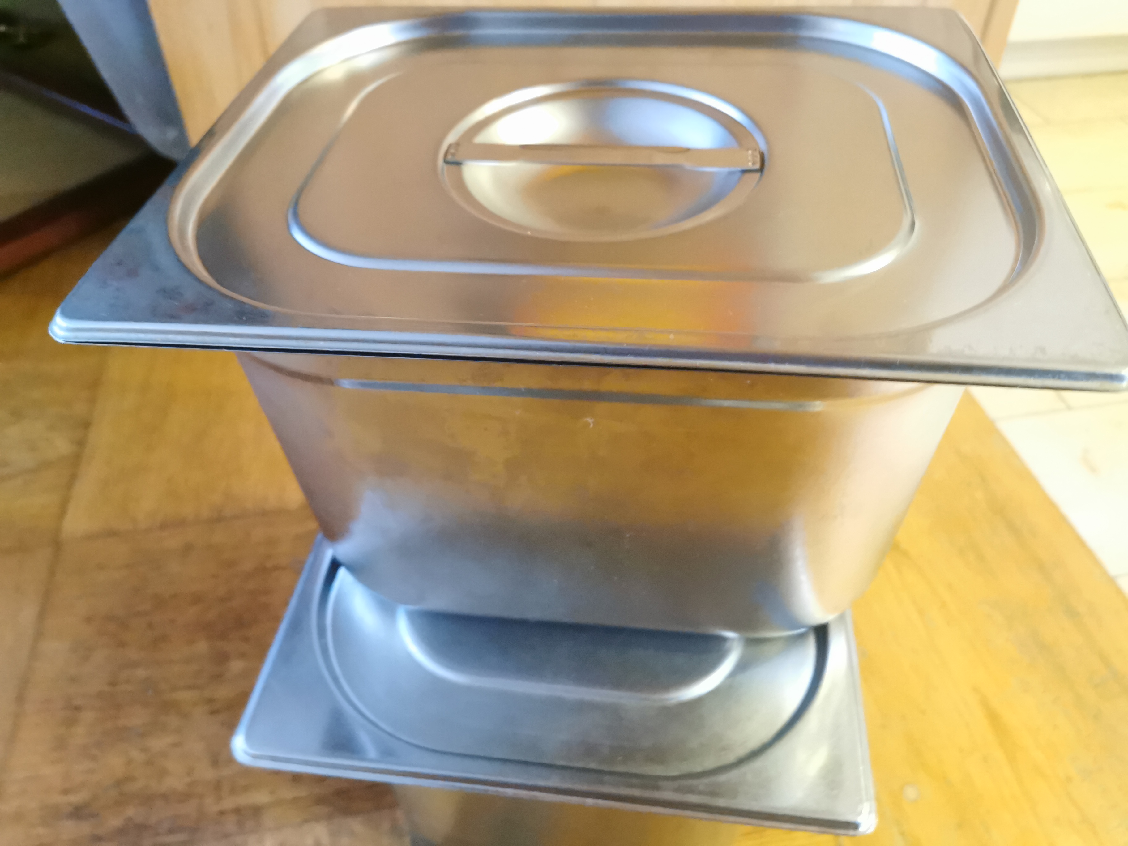 Ein passendes Gastronorm-Regal ist vor Ort und dort könnt Ihr Euer Wachs in Eure eigenen GN-Gafäße lagern (leserliche Beschriftung mit Namen/Vornamen ist essentiell!!).