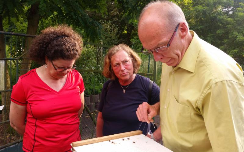 Viereinhalb Stunden ging es bei schönem, nicht zu heißem Wetter auf dem gut asphaltierten Havelland-Radwegs durch die Havelwiesen. Störche, Kraniche und Gänse ließen sich blicken und weder Panne noch Unfall trübten die Tour. In Brandenburg musste es dann noch quer durch die Altstadt gehen. Am höchsten Punkt der Stadt erwarteten uns schon die Imker der Brandenburger Vereins. Sie hatten einen tollen Tisch mit Blick über die Stadt reserviert und nach den gut 55 Kilometern waren alle Wasservorräte und Muskelreserven erschöpft. Nach dem Auftanken ging es dann - allerdings mit Motorkraft - zu dem etwas außerhalb gelegenen Lehrbienenstandes, den der Verein mit viel Ehrenamt pflegt und hegt.