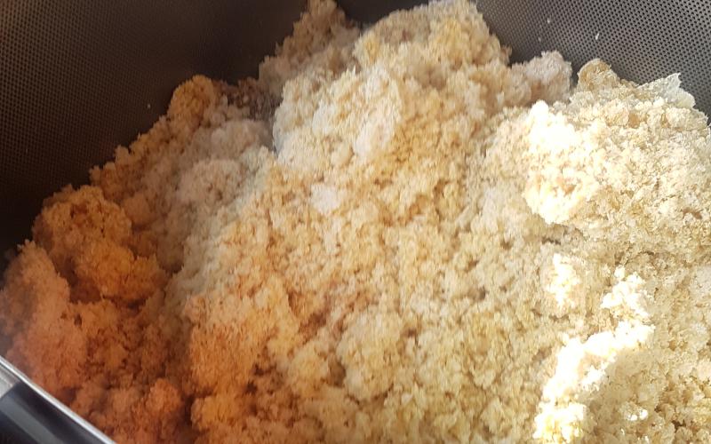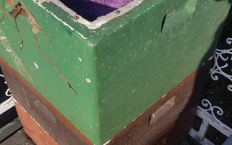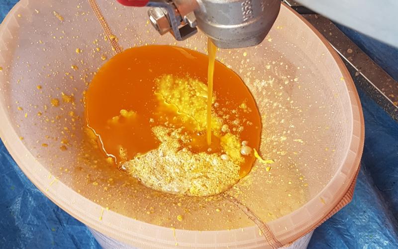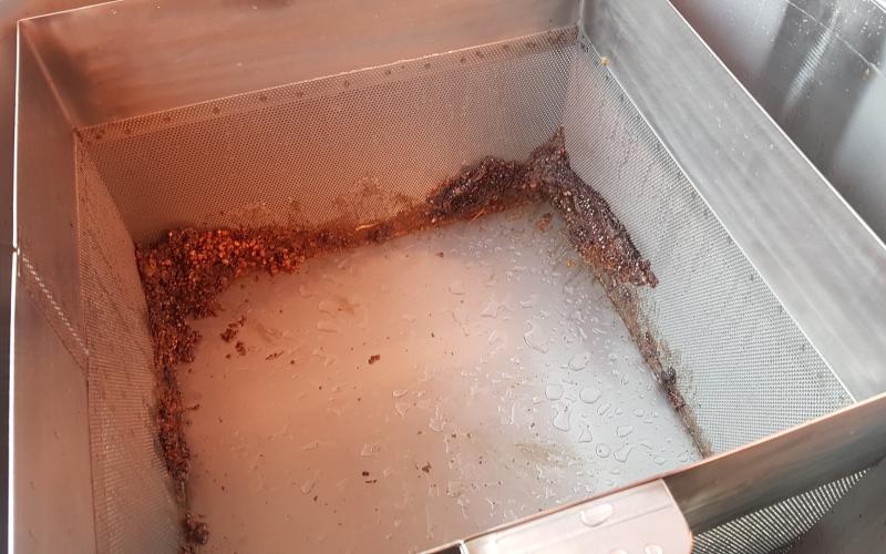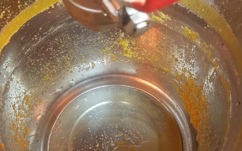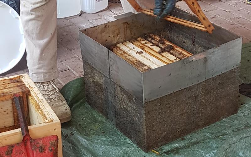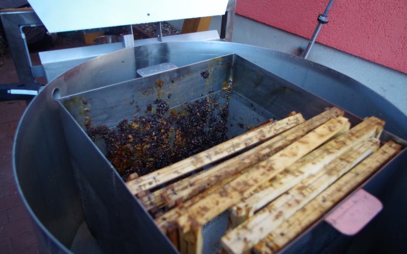 Das Ergebnis konnte sich dennoch sehen lassen - sehr trockener, allenfalls klebriger Trester. Sehr schnell konnten wir zwei Schleuderungen durchführen und jeweils 14 Waben ausschmelzen. 14 weitgehend Futter- und Pollen-geleerte Waben (DN 1,5) lieferten ca. 1,4 kg Wachs - also rund 100 Gramm pro Rähmchen. Das ist eine gute Ausbeute für das Format zumal das Wachs bereits sehr sauber gewonnen werden kann. Lässt man es durch einen Nylonstrumpf in einen im Wasserbad auf Schmelztemperatur gehaltenen Eimer fliessen so kann es anschließend im gut isolierten Zargenturm oder im Wärmeschrank langsam abkühlen und trennt sich sehr sauber. Nach dem Erstarren kann der Wachsblock auf der Unterseite abgekratzt werden. Im Tiefkühler gelagert kann er dann mit Hammer und Meissel gebrochen werden um stückweise für die weitere Verwendung aufgeschmolzen zu werden. Ein weiterer Reinigungsschritt durch Aufschmelzen in kalkfreiem Wasser ist offenbar nicht erforderlich. wobei uns Erfahrungen mit der Verwendung als Kerzenwachs noch fehlen.