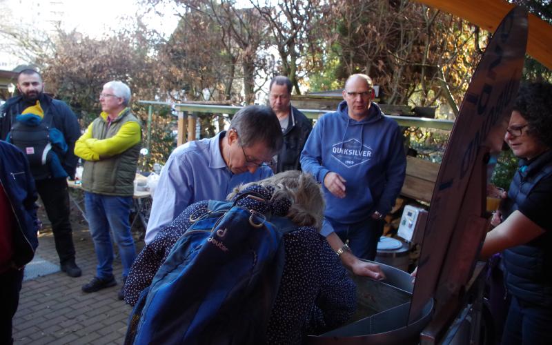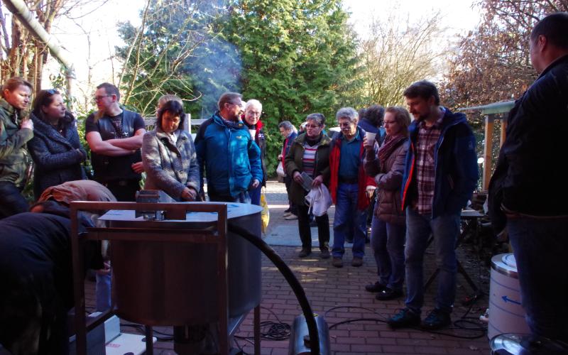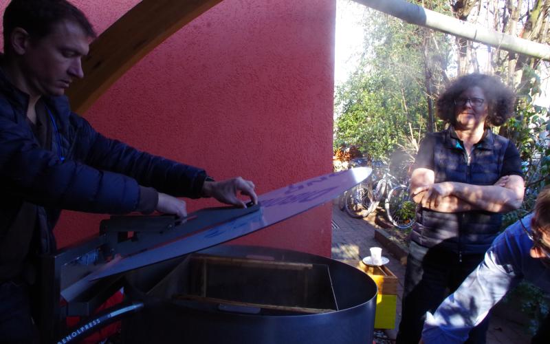 Bei strahlend-schönem Wetter und rund 14 Grad öffneten sich die ersten Elfenkrokusse und bekamen Bienenbesuch während wir uns zum "Wintergrillen" trafen und erstmals die HAMAG-Wachsschleuder in Betrieb nahmen.