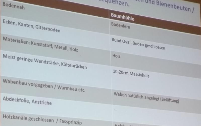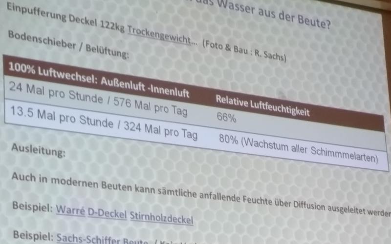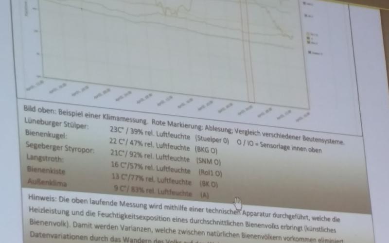Eine natürliche Baumhöhle sei oben durch eine Kappe aus Propolis isoliert, die wie eine Goretex-Membran Wasserdampf durchlasse aber Kondensat nicht. Dadurch könne das darüberliegende Holz über die Poren im Stirnholz große Mengen an Feuchtigkeit aufnehmen und daher eine besonders warme und trockene Atmosphäre - gerade im Winter - entstehen. Der dort gelagerte Honig diene dann auch als Wärmepuffer und kristallisiere nicht/langsamer. Nach seinen Messungen war der Strohkorb und die Klotzbeute noch am besten; die Segeberger war zwar vergleichbar warm aber viel zu feucht - optimal seien weniger als 80% Luftfeuchte bei 20°C. Die Bienenkugel sei in der runden Form eigentlich nicht korrekt proportioniert und leider auch nicht aus korrekt orientierter Holzmaserung geschnitten. Er gab in diesem Zusammenhang auch Bautipps für eigene "Trockenzargen" um Beuten trocken zu legen.