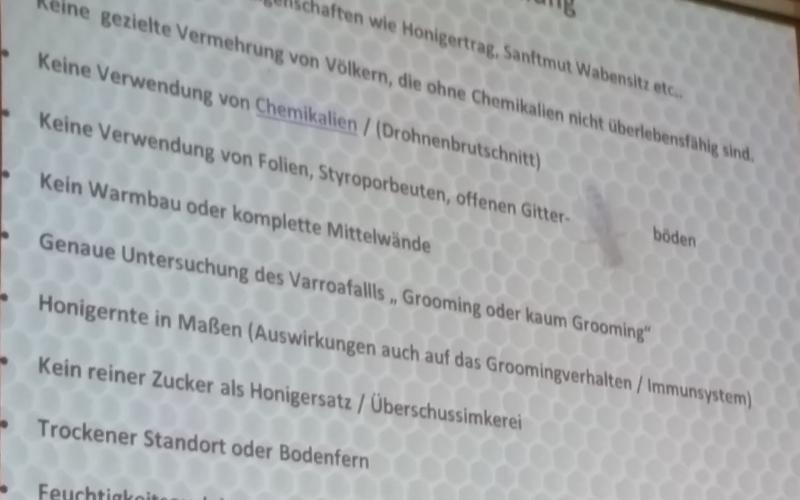 Positiv: bereitwillige Anleitung zum Selber-Optimieren vorhandener Beuten durch "Trockenaufsätze" mit Thermo-Hanf oder Hanfstreu um die Feuchtigkeit zu senken. Auch das Grooming kann man durch 20fache Vergrößerung der abfallenden Milben selber prüfen und sollte solche Völker bei der Nachzucht besonders würdigen. Anschaulich demonstrierte er die Unterschiede zwischen Stirnholz, durch das man sichtbar blasen kann und längsgeschnittenes Holz, das keine Feuchtigkeit aufnimmt. Seine Untersuchungen untermauern viele alte Lehren wie z.B. das hochgeständerte Aufstellen der Beuten (trockener!) und geben Warrés "Kissenzarge" eine späte Würdigung!